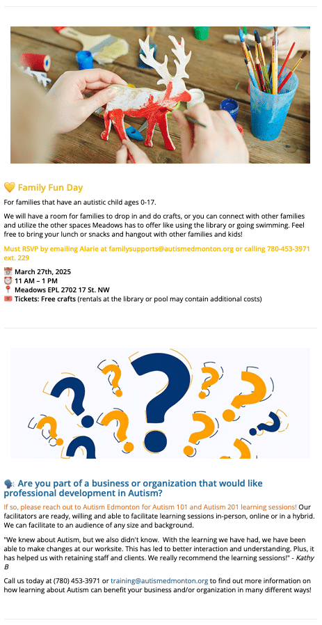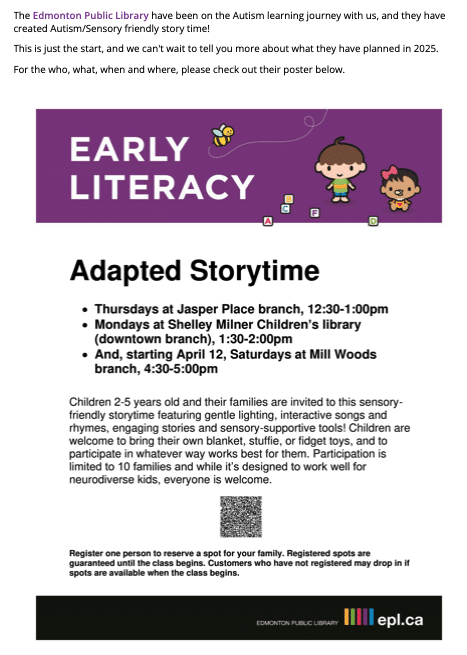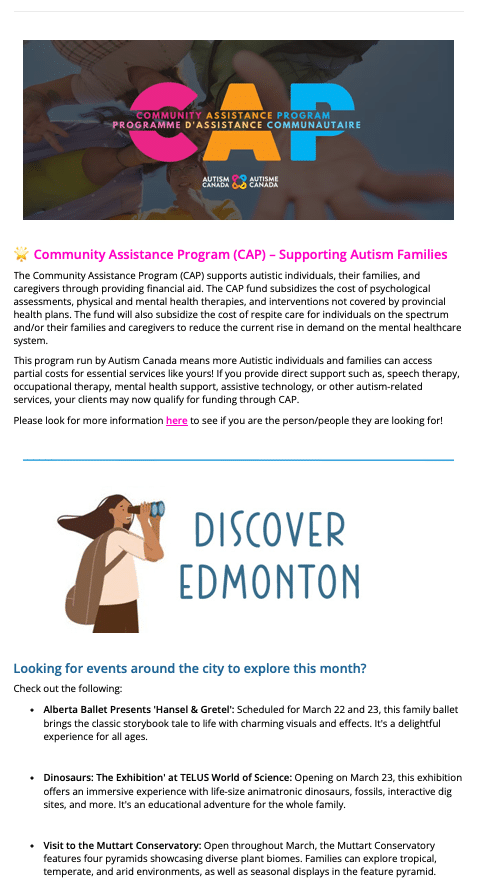 Autism Edmonton and the Glenrose have created a program together called “Family Navigators”. Once a family has received a diagnosis from the Glenrose, the diagnostic team will send the family’s contact information to Autism Edmonton so that we can assist them in finding resources and supports within the community that meet their current and future needs.