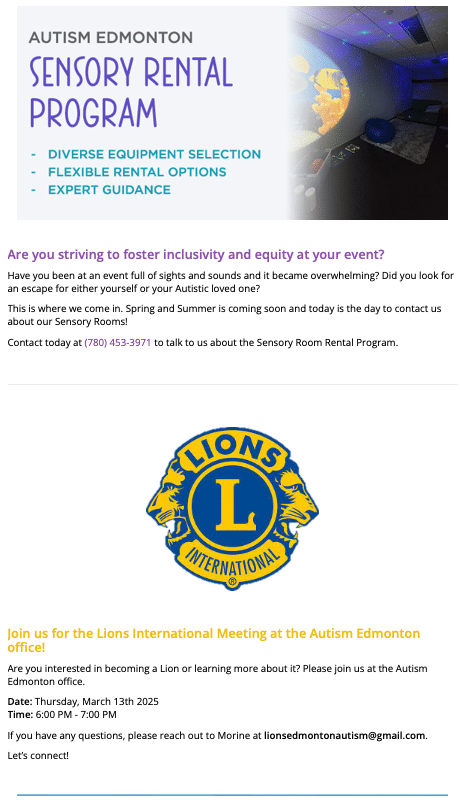 Autism Edmonton and the Sinneave Foundation have been working alongside one another since 2012. The Foundation has funded many Autism Edmonton’s projects as well as provided necessary and meaningful training to Autism Edmonton staff that is shared annually with the Autism Edmonton membership.