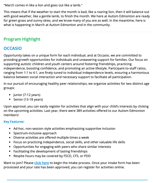 Inclusion Alberta is a family-based, non-profit federation that advocates on behalf of children and adults with developmental disabilities and their families. They share a dream, with their partners and allies, where children and adults are valued, participating, and welcomed community members. Autism Edmonton and Inclusion Alberta work together in many different facets, including many advocacy endeavours.