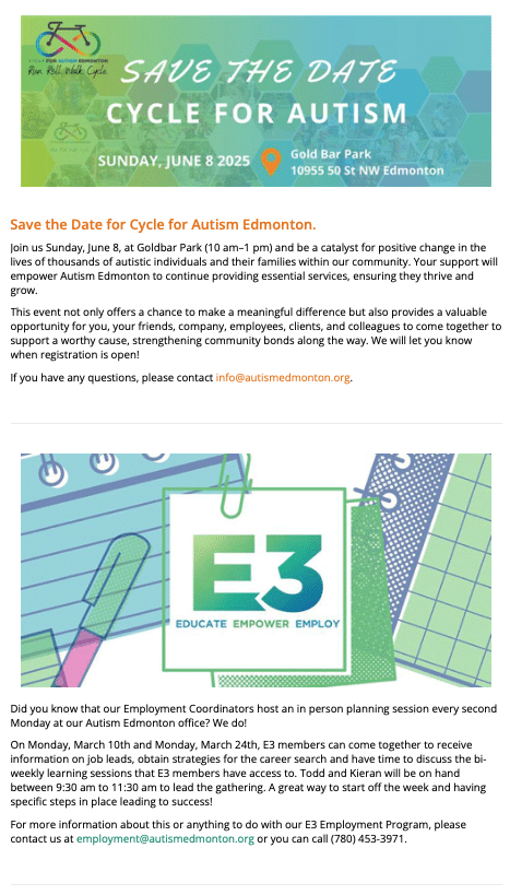 “We enjoy continuing our support to Autism Edmonton because of the local impact Autism Edmonton makes to better the lives of people with autism in the Edmonton area. In addition, there are members of our team that have friends or family that have autism and we understand and appreciate the importance of Autism Edmonton’s efforts to support and to build awareness for people with autism.”