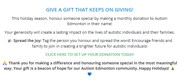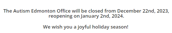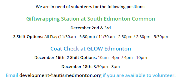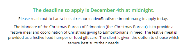 Promotion of the spirit of Christmas caring and sharing in the City of Edmonton. To provide a festive meal and coordination of Christmas giving to Edmontonian’s in need. Autism Edmonton has partnered up with the Christmas Bureau to help ensure those who want to celebrate the festive season are able to with out the financial barriers. Autism Edmonton helps support our membership in organizing hampers and assisting our members in filling out the application.