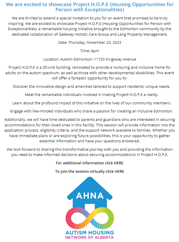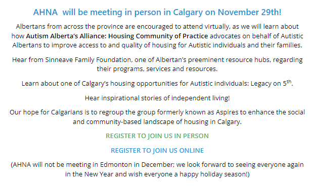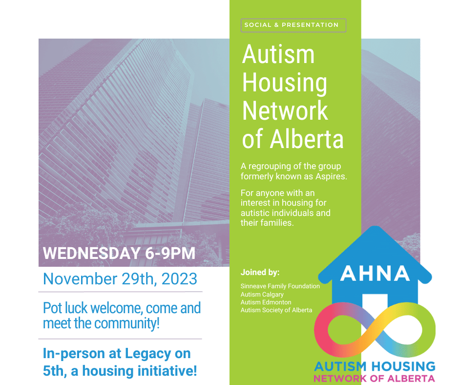 Autism Independent Living Association (AILA) is a non-profit, volunteer run organization that is working towards building an intentional supportive housing community in Edmonton. Autism Edmonton attends monthly meetings to showcase support for this ongoing project.