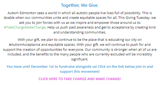 “We enjoy continuing our support to Autism Edmonton because of the local impact Autism Edmonton makes to better the lives of people with autism in the Edmonton area. In addition, there are members of our team that have friends or family that have autism and we understand and appreciate the importance of Autism Edmonton’s efforts to support and to build awareness for people with autism.”