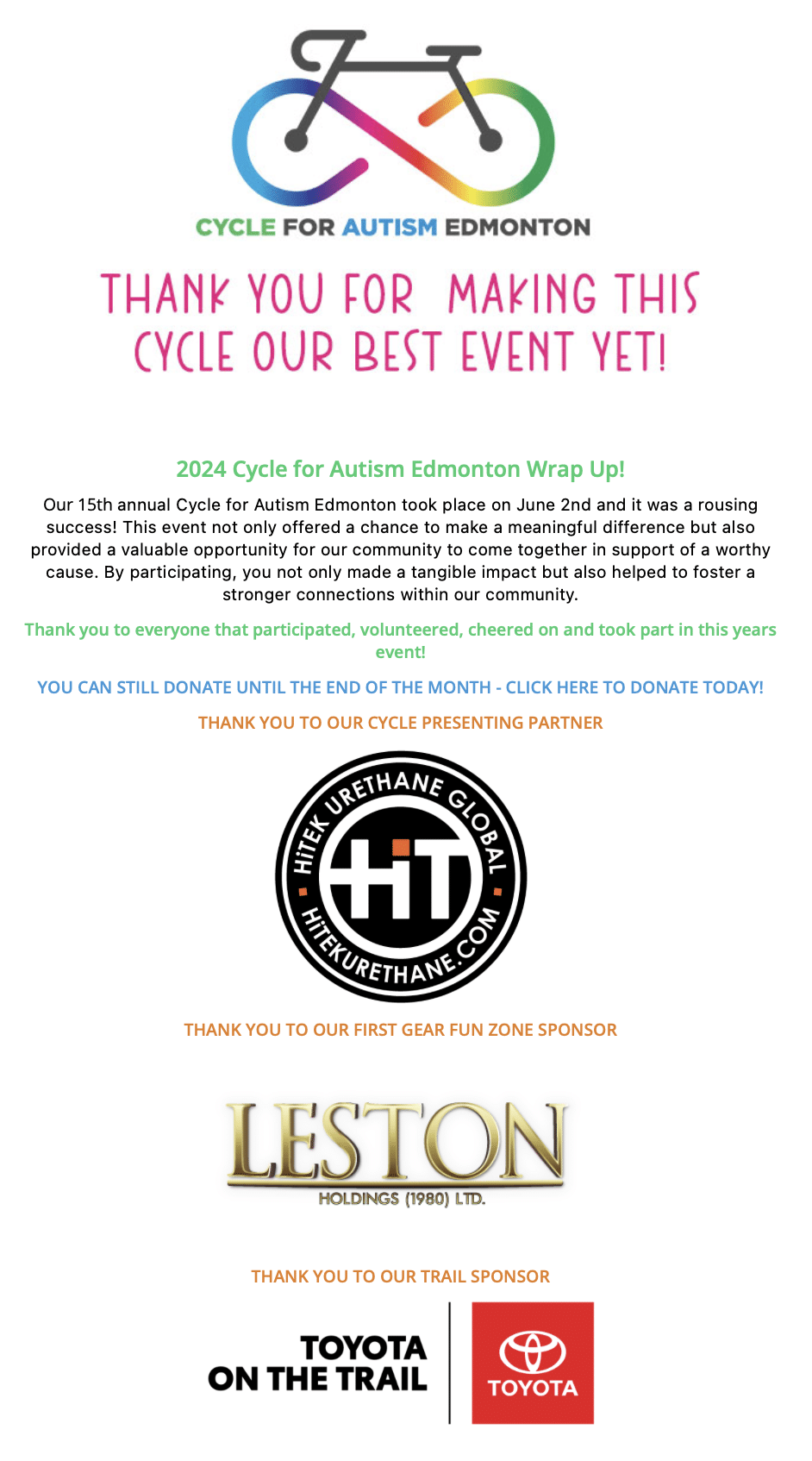 HiTEK Urethane has been the Title Sponsor of Autism Edmonton’s Cycle for Autism since 2016. Not only has their commitment helped support the programs and services Autism Edmonton offers but it has directly impacted the lives of autistic individuals and their families in our community. We are fortunate to have them cycling by our side each year!