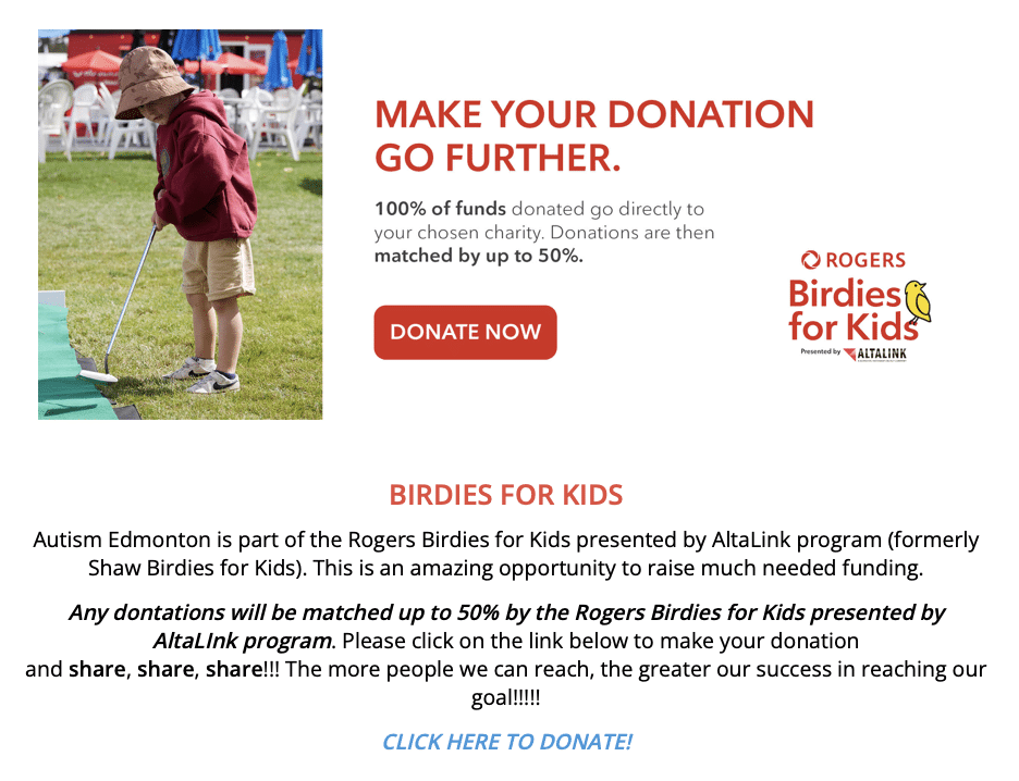 Since 2020 Birdies for Kids has been matching donations made to Autism Edmonton up to 50%. Thanks to the commitment of individuals who donate to Autism Edmonton, this has generated an extra $75,000.00 in funding to Autism Edmonton. The Shaw Charity Classic has raised over $76 million and has supported more than 230 charities.