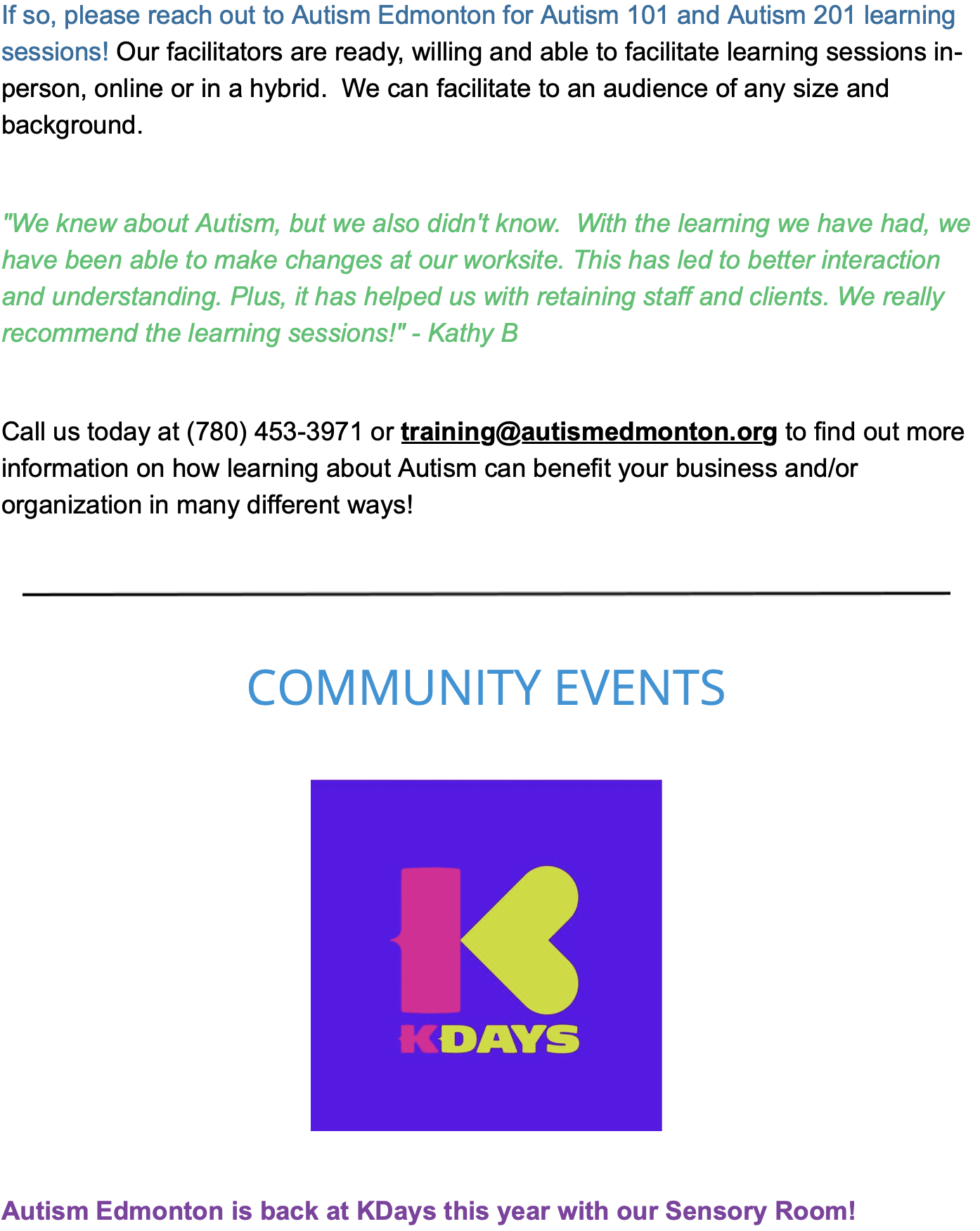 “We enjoy continuing our support to Autism Edmonton because of the local impact Autism Edmonton makes to better the lives of people with autism in the Edmonton area. In addition, there are members of our team that have friends or family that have autism and we understand and appreciate the importance of Autism Edmonton’s efforts to support and to build awareness for people with autism.”