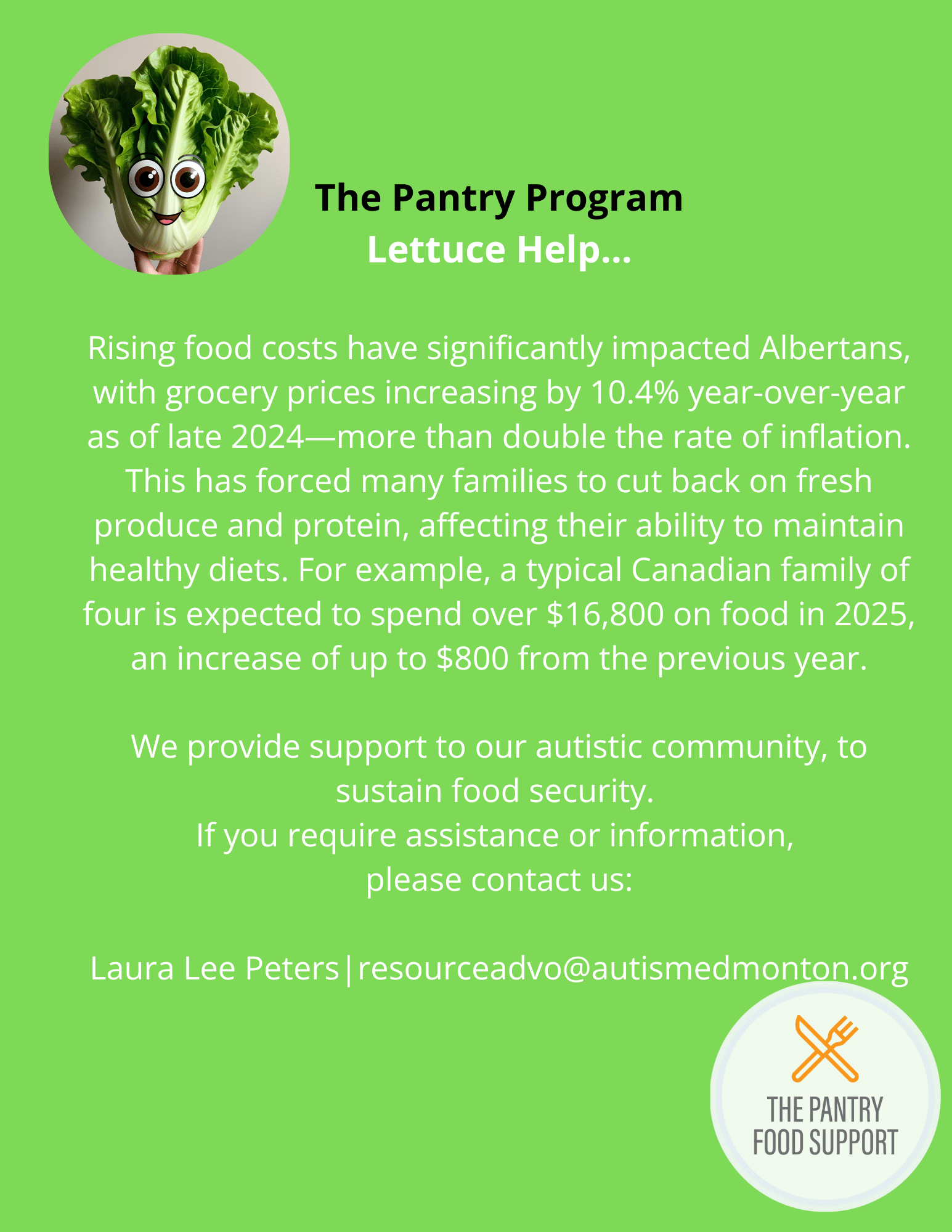 The Edmonton Food Bank are the stewards in the collection of surplus and donated food for the effective distribution, free of charge, to people in need in our community. At Autism Edmonton, our pantry program partners with them to assist with food security for our autistic membership in a safe, sensory friendly and understanding environment.