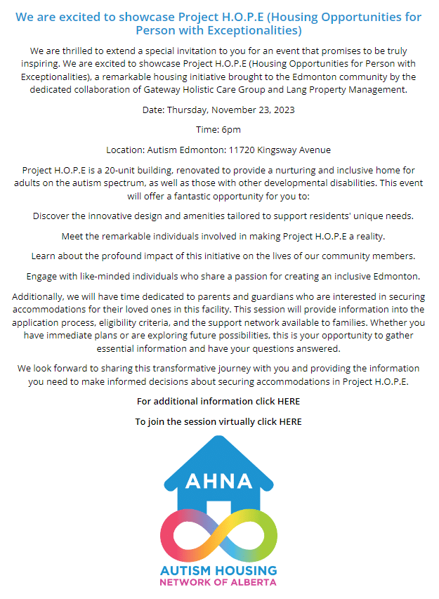 Autism Independent Living Association (AILA) is a non-profit, volunteer run organization that is working towards building an intentional supportive housing community in Edmonton. Autism Edmonton attends monthly meetings to showcase support for this ongoing project.