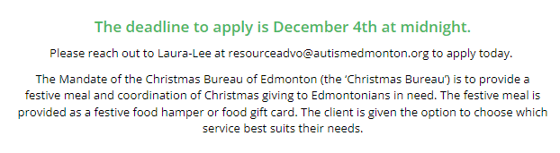 Promotion of the spirit of Christmas caring and sharing in the City of Edmonton. To provide a festive meal and coordination of Christmas giving to Edmontonian’s in need. Autism Edmonton has partnered up with the Christmas Bureau to help ensure those who want to celebrate the festive season are able to with out the financial barriers. Autism Edmonton helps support our membership in organizing hampers and assisting our members in filling out the application.