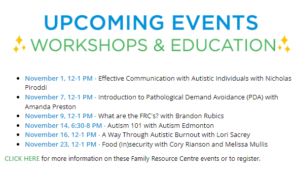 Family Resource Centres – Autism Edmonton is part of the Autism Alberta Family Resource Centres. We work alongside the Family Resource Coordinators, and we provide training and materials to the coordinators as well as free training opportunities for families across the province