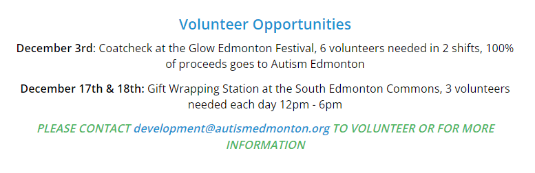Promotion of the spirit of Christmas caring and sharing in the City of Edmonton. To provide a festive meal and coordination of Christmas giving to Edmontonian’s in need. Autism Edmonton has partnered up with the Christmas Bureau to help ensure those who want to celebrate the festive season are able to with out the financial barriers. Autism Edmonton helps support our membership in organizing hampers and assisting our members in filling out the application.